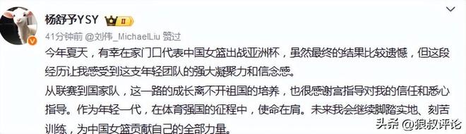 杨舒予发文表示:今年夏天,有幸在家门口代表中国女篮出战亚洲杯,虽然最终的结果比较遗憾,但这段经历让我感受到这支年轻团队的强大凝聚力和信念感。