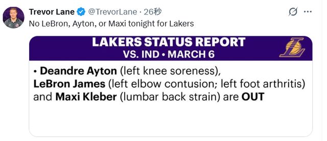 左肘挫伤+左脚关节炎!老詹今日缺战步行者 湖人共计三人无法出场