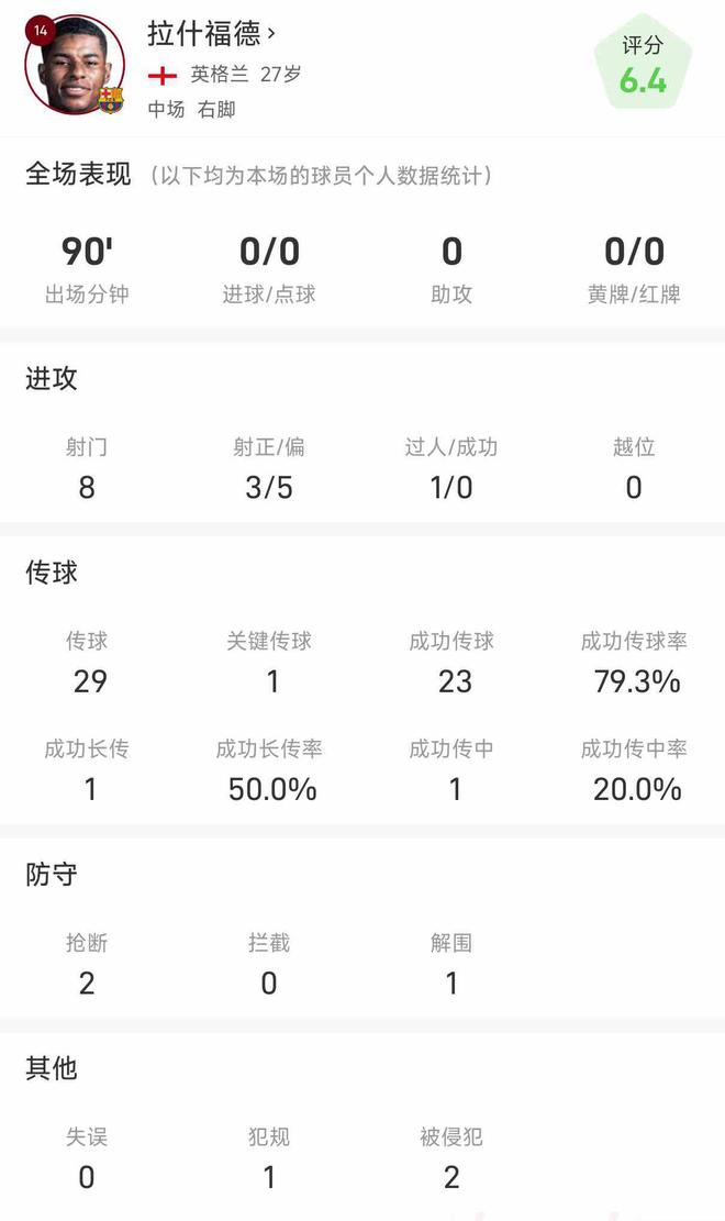 雷速体育10月19日讯 本轮西甲,巴萨主场2-1击败赫罗纳,拉什福德本场比赛踢满了90分钟,未能进球。